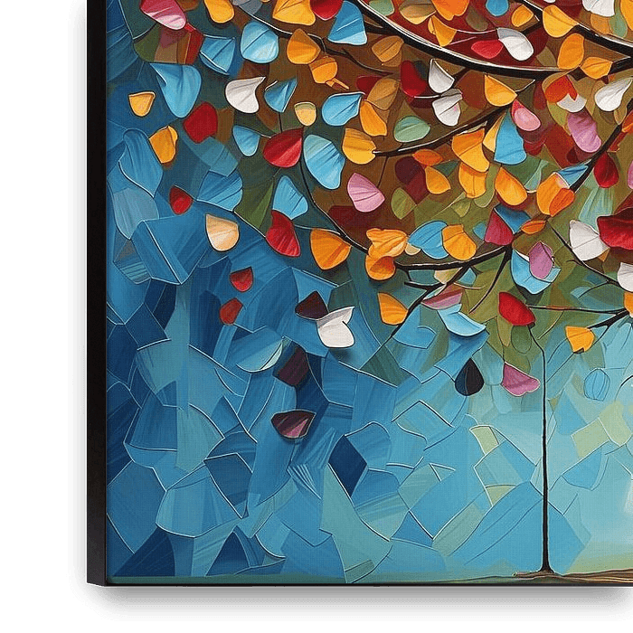 A fictitious painting of a tree with colourful leaves against a blue background in the style of a children's book illustration.
