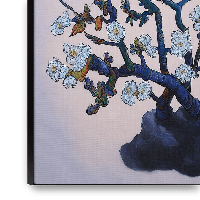 This artwork depicts an elegant blossom tree with white flowers, set against a dark background that lends strength and stability to the whole. The branches are rich in colour and movement, with playful shades of blue, green and warm accents that give the work an almost fantastical appearance.