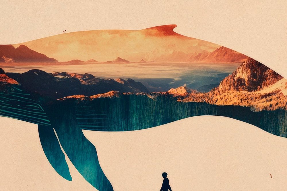 A gigantic whale in which a breathtaking landscape unfolds draws the eye and conveys a sense of freedom and adventure. The gentle colour gradients and harmonious composition create an inspiring atmosphere that fits perfectly in a living room to encourage creative conversations and bring dreams to life.