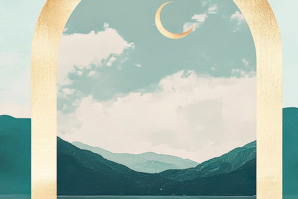 A golden frame opens up the view of a dreamlike landscape where gentle hills meet the calm water. The delicate moon is in the sky, while soft clouds drift over the horizon. This harmonious scene brings tranquillity into the home and is perfect for the bedroom to encourage relaxing dreams and inspiring thoughts.