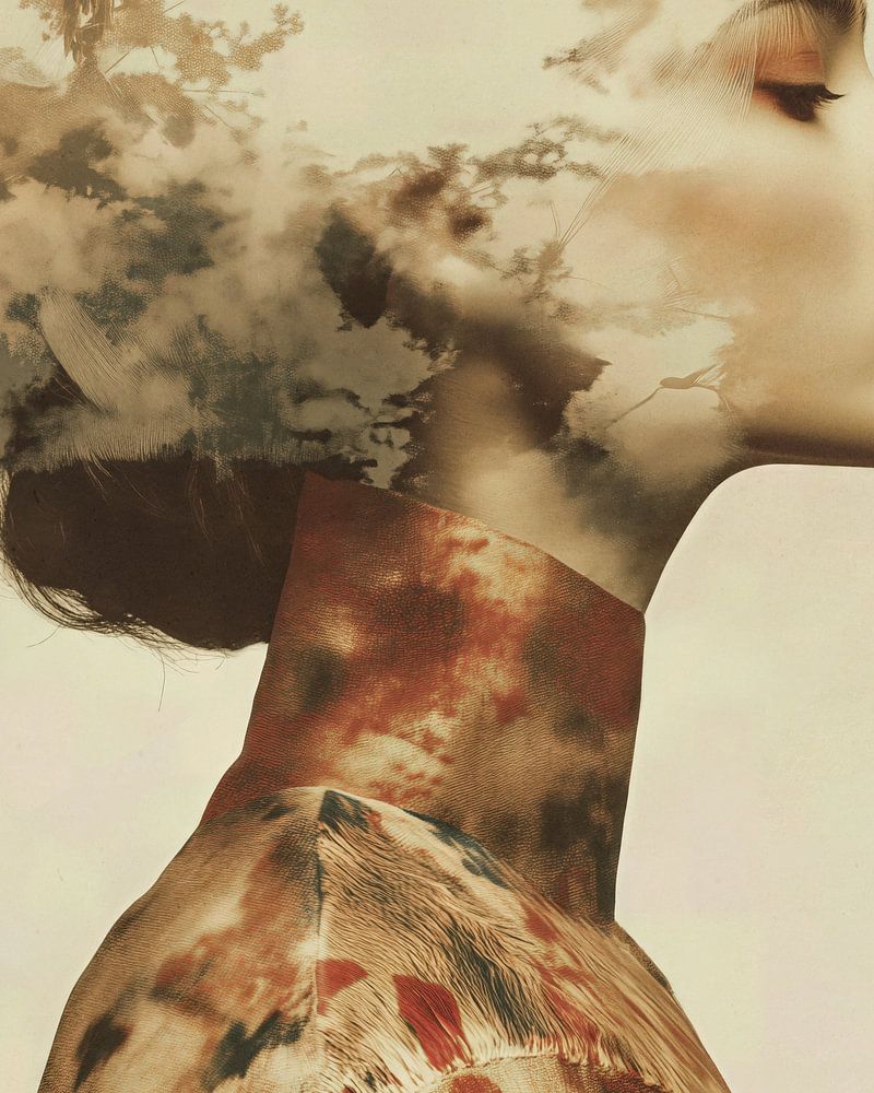 A surreal portrait of a woman in profile whose thoughts dissolve into clouds and flying birds. The artwork blends human emotion with nature, symbolizing freedom, imagination, and the quiet expansion of the mind beyond physical boundaries