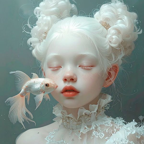 A striking and beautiful girl, with pale porcelain-like skin, has white hair styled into two curly buns on her head. Her eyes are closed and a silvery-white fish—the symbol of luck, purity and innocence—floats before her face. She is immersed in her dream world, and her white lace dress lends the scene a magical and serene atmosphere.…