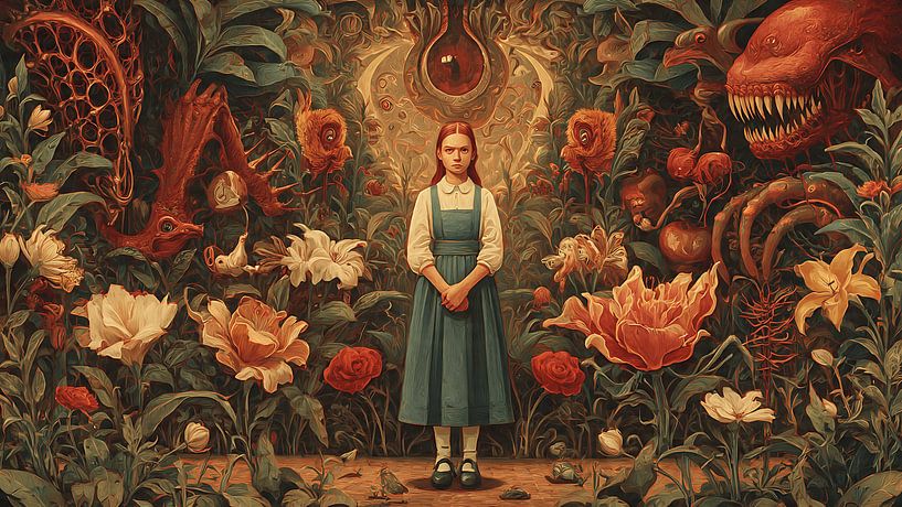 This vintage style oil painting illustration captures a beautiful woman standing gracefully inside a surreal dreamscape filled with golden light and atmospheric depth. The composition blends romantic classicism with subtle surrealism, creating a timeless fine art aesthetic perfect for modern interiors. Rich brush textures, dramatic…