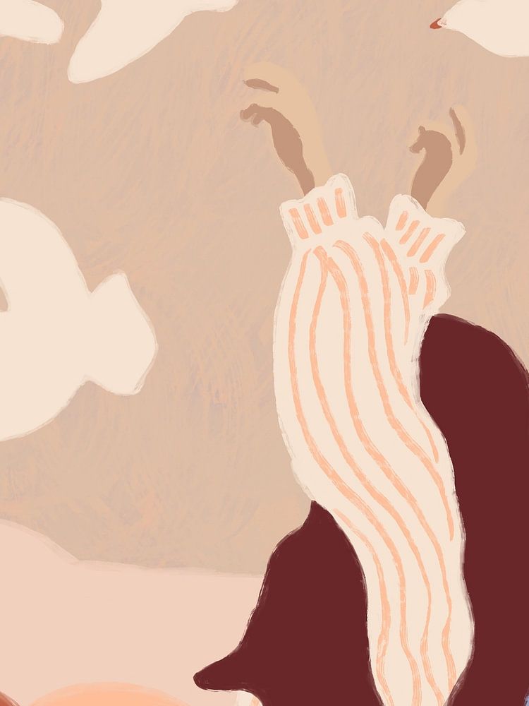 The artwork shows a woman in a white and peach pink striped, dashing dress with romantic puff sleeves. Her long, wavy burgundy hair dances along in the wind as she raises her arms gracefully in the air.