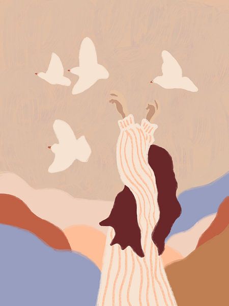 Buy this landscape artwork Dreamy woman with white doves by Anna Benge on canvas, ArtFrame, poster and wallpaper, printed on demand in high quality.