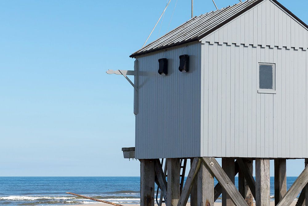 Het historische Drenkelingenhuisje op het Noordzeestrand van het eiland Terschelling in Nederland. In vroeger dagen gebruikt als eerste onderkomen voor drenkelingen.