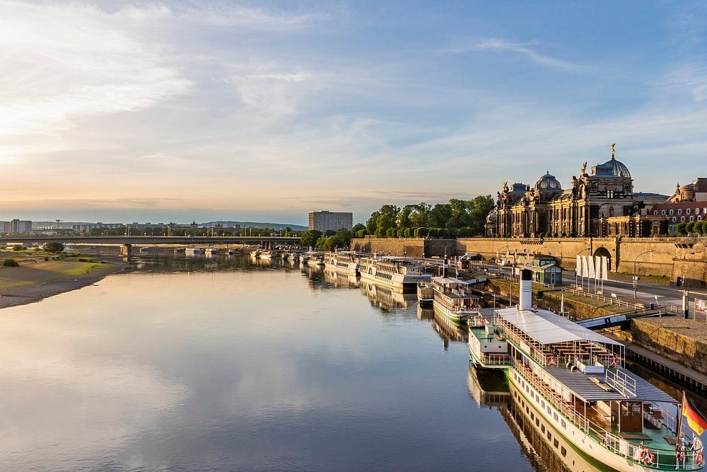 Paddle steamer in front of the Brühl Terrace on the Elbe, the Academy of Arts and the Frauenkirche in Dresden at sunrise, Saxony, Germany.
