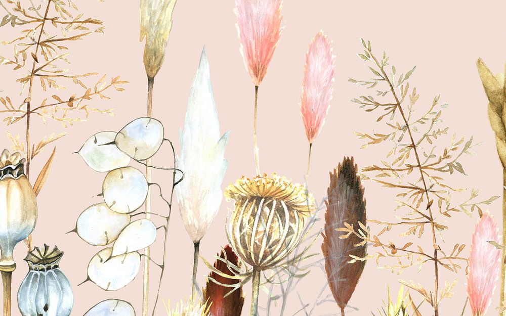 Dry flowers and pampus grasses in beautiful natural colours made in watercolour.