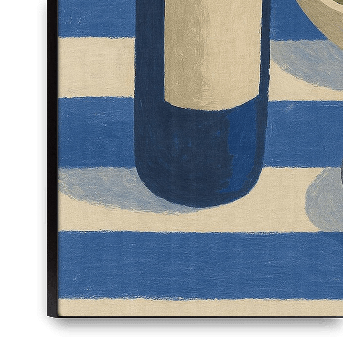 In this artwork, red wine, olives and a fig are brought to life in a mix of vintage colours and shades, which blend beautifully and evoke the warm atmosphere.