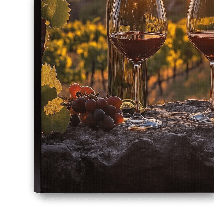 Still life of wine glasses overlooking the vineyard at sunset.