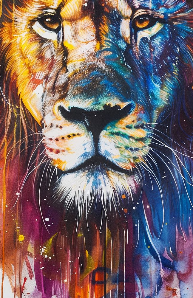 Drip & Splash is a small colourful series of works with paint splashes and drips, in which animals take centre stage. In this work, it is the royal lion.