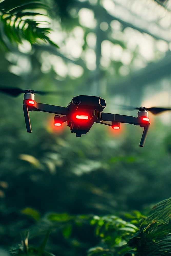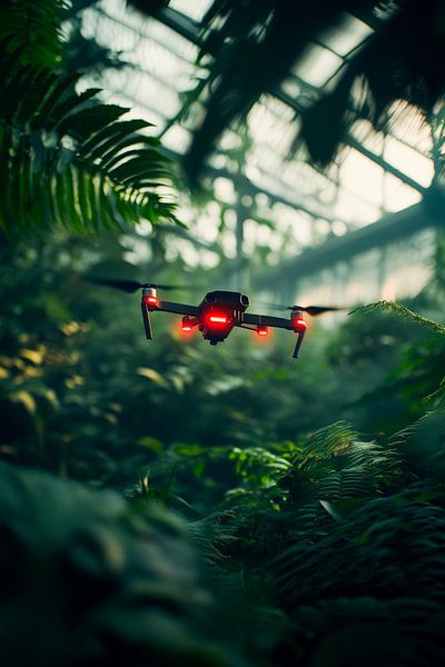 A futuristic drone body with a bright red light hovers in the midst of lush, green plants. This fascinating interplay of technology and nature conveys a sense of adventure and discovery. Ideal for the living room, it brings a touch of innovation and creativity to your space while stimulating thought.