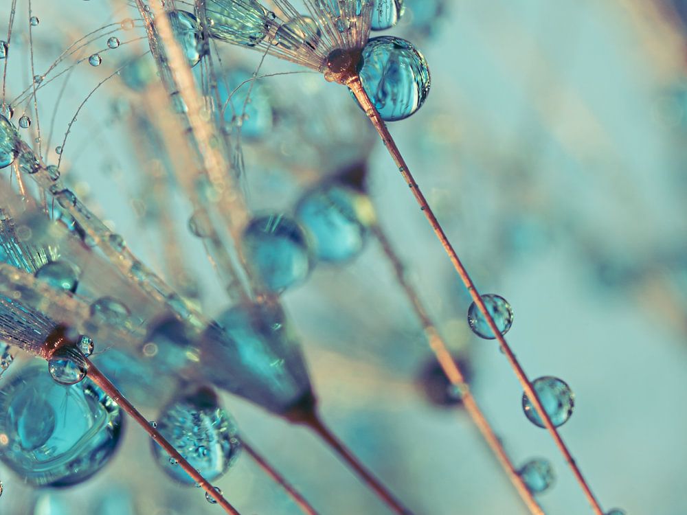 "Droplets on a Fluffy Ball" is a macro photograph of water droplets on the fluff of a dandelion with a cyan, blue, turquoise background. The fluff of the dandelion is also warm golden in color due to the "golden" light.