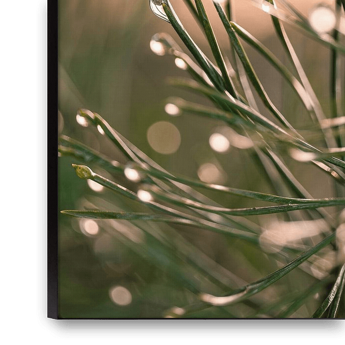 Raindrops on the needles of a pine tree during the warm colours of sunrise are a gift.