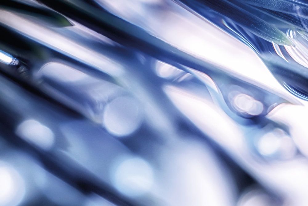 The last raindrops cling to the pine needles and shimmer in the cool blue light. Macro photography.