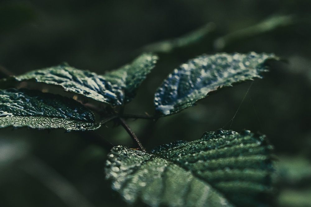 Enter the intimate world of nature, where every detail tells a story of life and renewal. This fascinating picture shows a close-up of a twig with leaves, still glistening from the raindrops that lie like pearls on their surface.