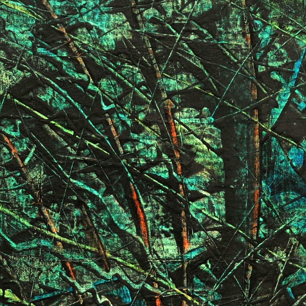 This painting is titled: ''Verdronken tekst''. The Hungarian texts in the bottom layer are barely visible.... The blue varnish evokes a surreal underwater world. The texts are overgrown by all kinds of (life) forms.... Impermanence in view.... Nature overcomes....