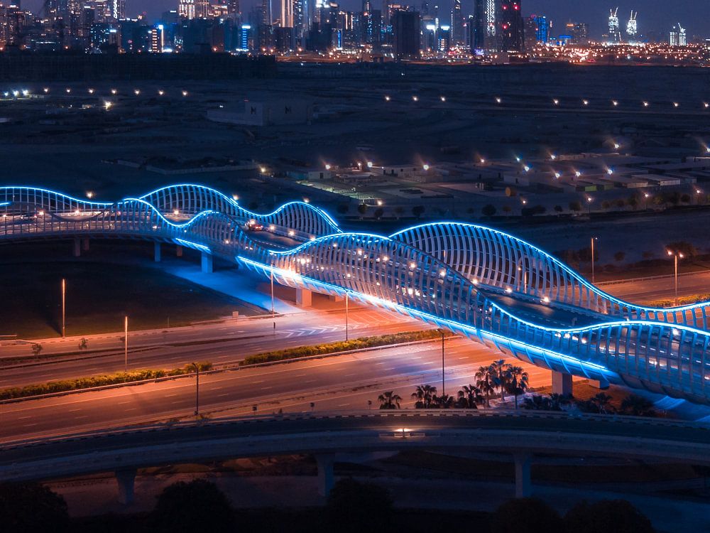 Dubai Meydan Bridge in blue with the Dubai Skyline in the background during the blue hour.