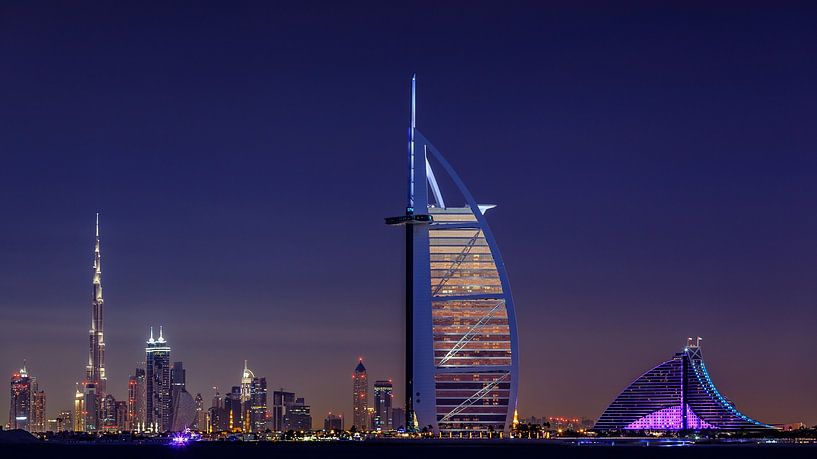 Dubai skyline with a view of Burj al Arab, Burj Khalifa and modern Dubai after sunset