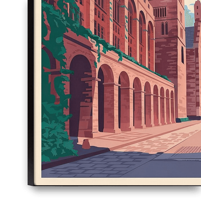 Nestled between impressive, sandstone-coloured arches and the majestic tower, a quiet street runs through the heart of Dublin. The soft blue skies and softly lit brick structures convey a sense of history and charm, while the surrounding nature embraces the architectural splendour. An inviting view of this city's vibrant culture.