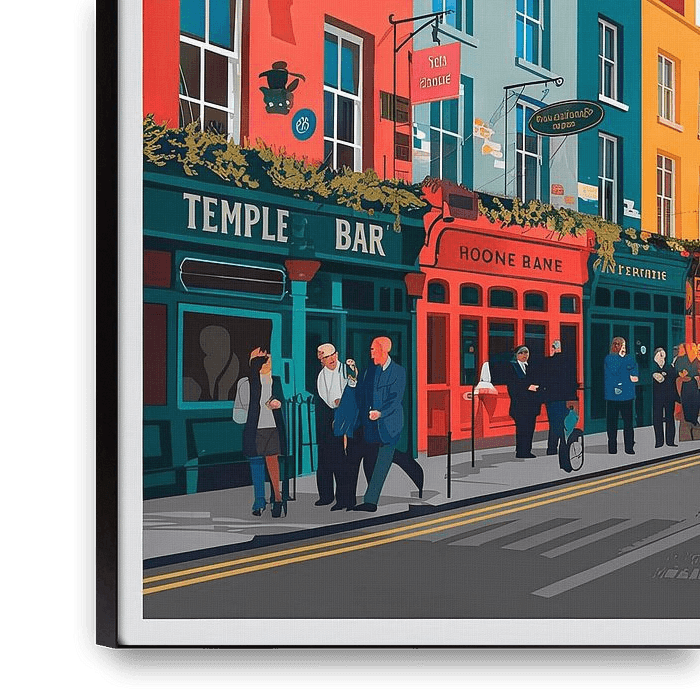 Vibrant colours and historic facades give this scene an inviting charm. The vibrant Temple Bar is home to people enjoying Dublin's heritage, while the blue sky backdrop creates a cheerful atmosphere. It's a place full of stories, where tradition and zeitgeist blend harmoniously.