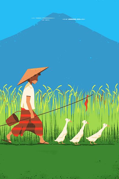 This duck herder walks his ducks through a rice field with a volcano in the background in Bali, Indonesia. The Balinese duck is recognizable by its white color and plume on its head. This illustration is part of a series on Bali.