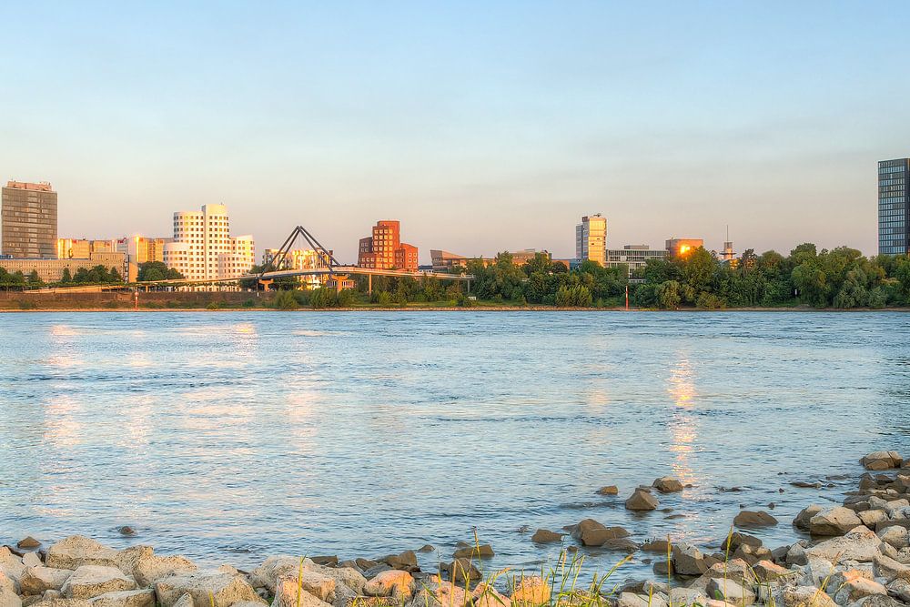 View from the banks of the Rhine towards the Media Harbour in the evening.