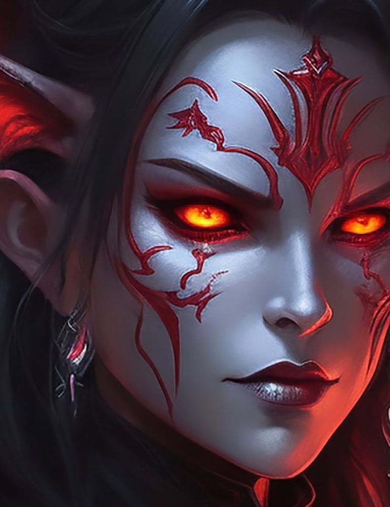 Fantasy vrouw in een portret met vuur en hoorns de ogen geven ook een vuur gloed dit door de AI gegenereerd beeld is voor de liefhebbers.