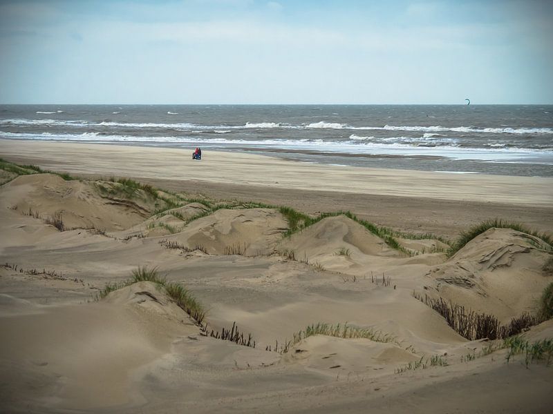 people are walking on the beach again this autumn, the strong winds create big waves in the sea. The sand blows back and forth over the dunes.
