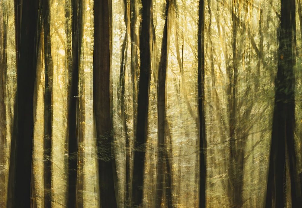 Landscape on the Duno estate in Doorwerth, Gelderland during the golden hour after sunrise. ICM, or intentional camera movement, was used here, making the scene abstract and dynamic. The forest is already showing beautiful autumn colours.