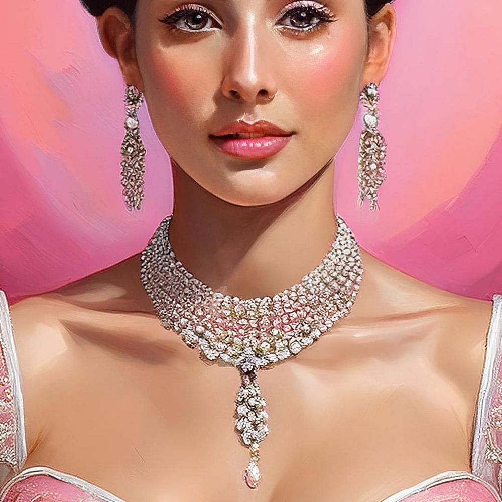 A portrait of a woman with black hair, beautiful earrings, a necklace of pearls and a pink lace dress with cleavage. With this work, you will make a real statement on your wall! Living style eclectic, neoclassical and contemporary.
