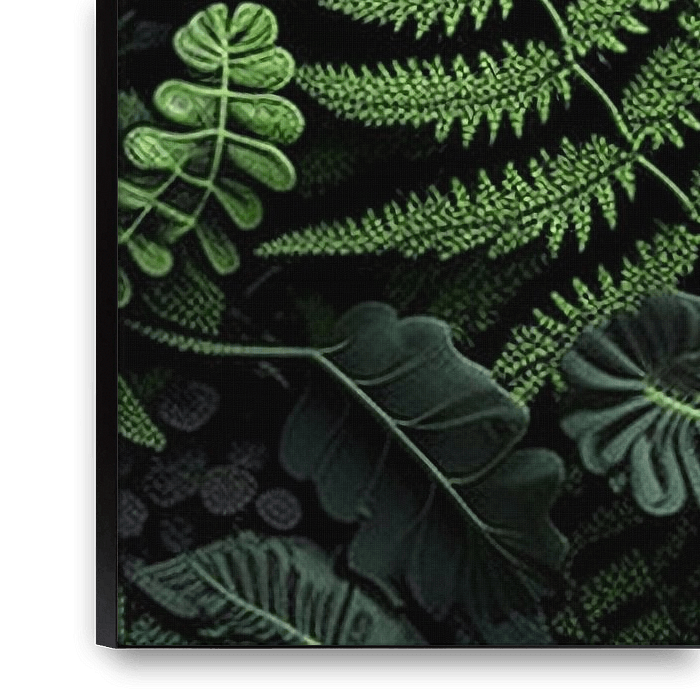 A detailed illustration of various fern leaves with an elegant blend of green and purple colour tones against a dark background. The overlapping foliage creates a vibrant, textured tapestry that emphasises the intricate shapes and variety of the individual leaves. Perfect for adding a touch of natural beauty and sophistication to any…