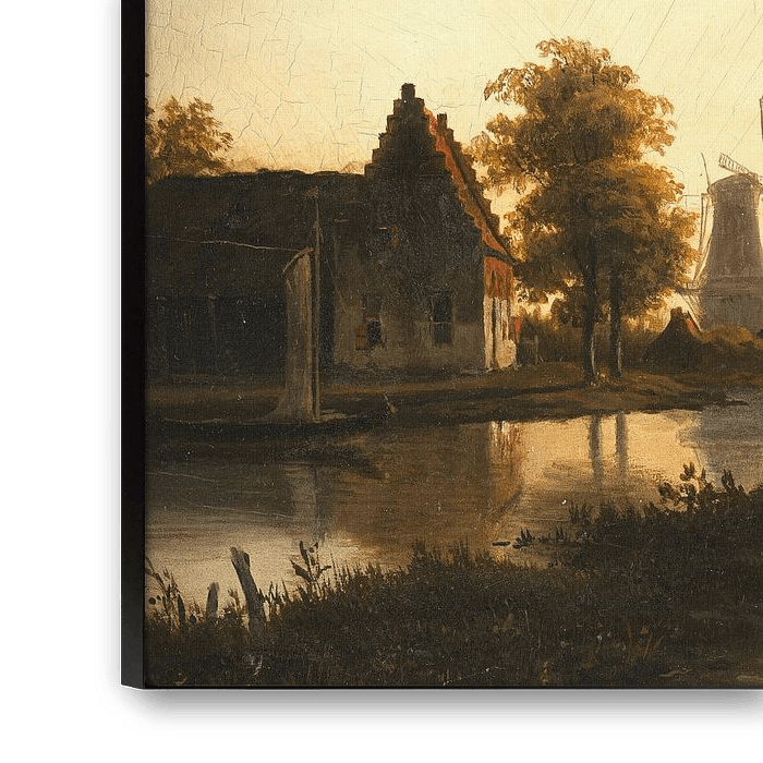 A glowing sunset behind him, a workman returns home, his dog leading the way along the canal road. At river's edge, water, windmills, a small boat, and a storehouse are reflected in the water. Though likely arranged at the artist's fancy, the scene is precisely painted, down to the riverbank plants defined with small, sure strokes.