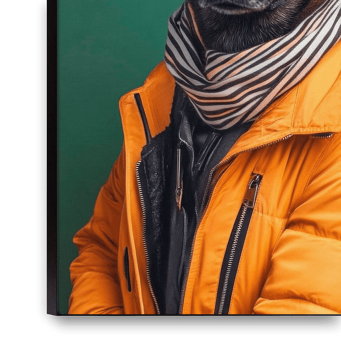 With his sharp, alert eyes and stylish sunglasses look, this Dutch Shepherd radiates an unconventional coolness. Wrapped in a warm, orange-coloured coat and a fashionable scarf, he embodies charming self-confidence and at the same time exudes a touch of adventure. A true trendsetter among four-legged friends!