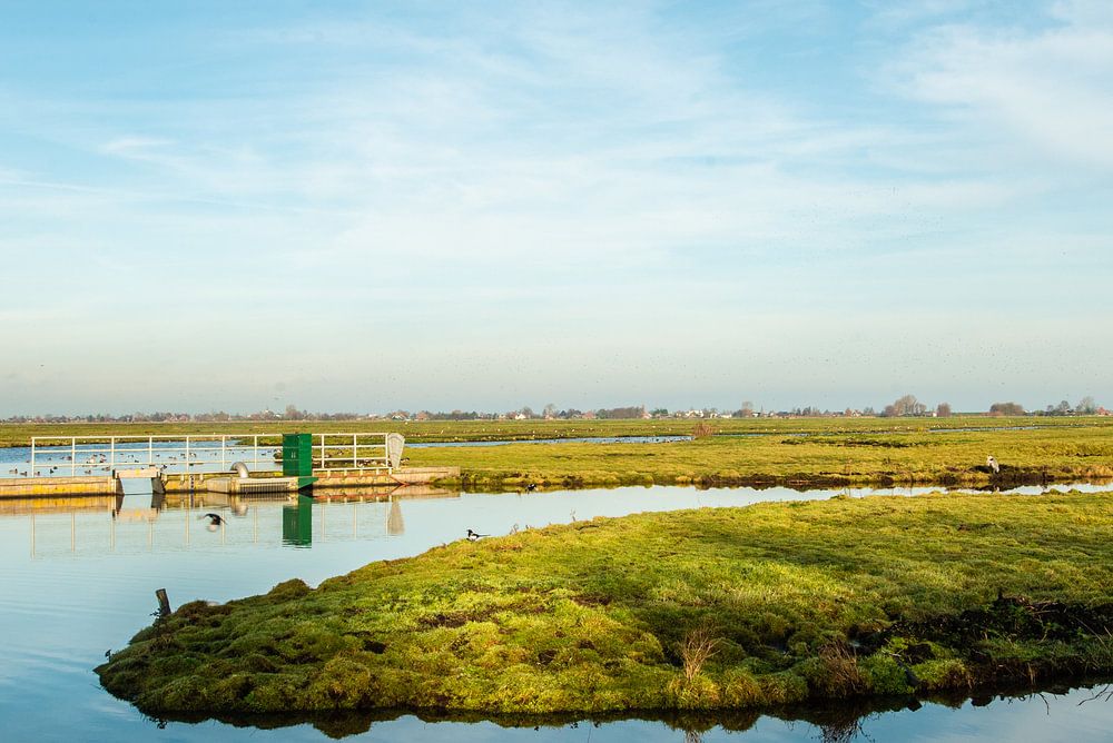 Dutch landscapes with ditches and meadows and villages on the horizon.