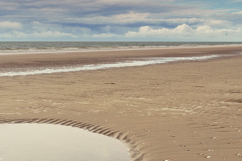 Pool of water on the beach of Rockanje. Clouds approaching the coast with a gentle breeze in the air.