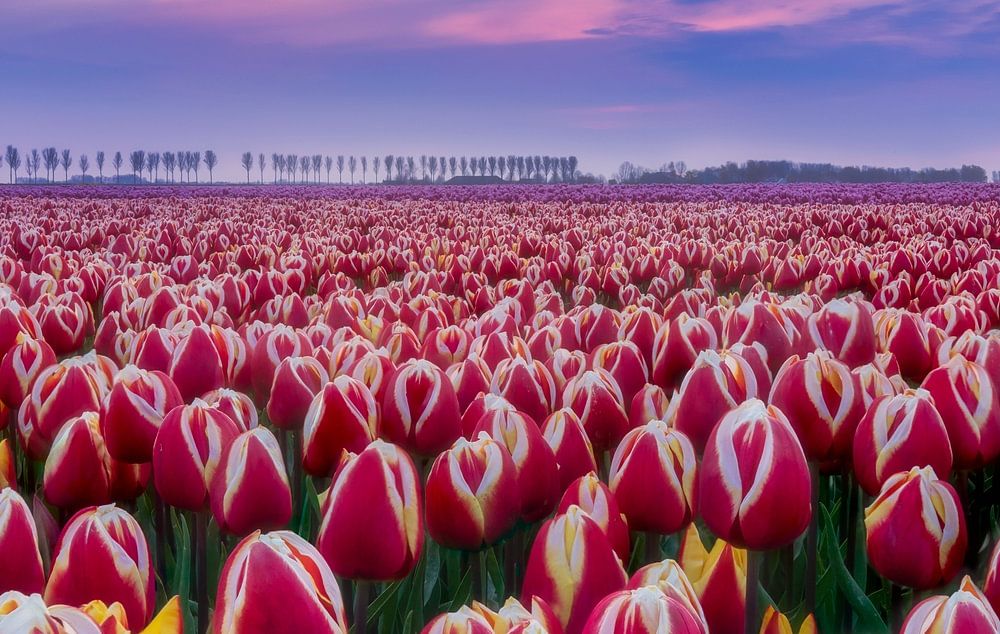 A field of red-and-white striped tulips stretches into the distance forming natural mosaic. A cloudy sky casts a soft light over the scene.