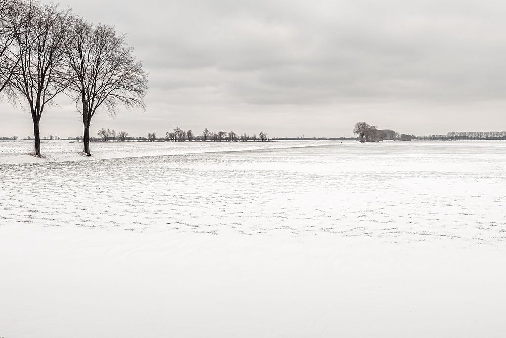 Dutch winter landscape on a cloudy day. It has snowed heavily and there is a thick layer of untouched snow on the field. At the edge of the field are three bare trees in a row. The photograph was taken near the village of Hooge Zwaluwe, in the municipality of Drimmelen, province of Noord-Brabant.