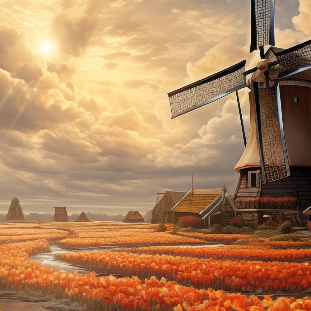 Dutch landscape; tulips. a windmill and a beautiful sky.
