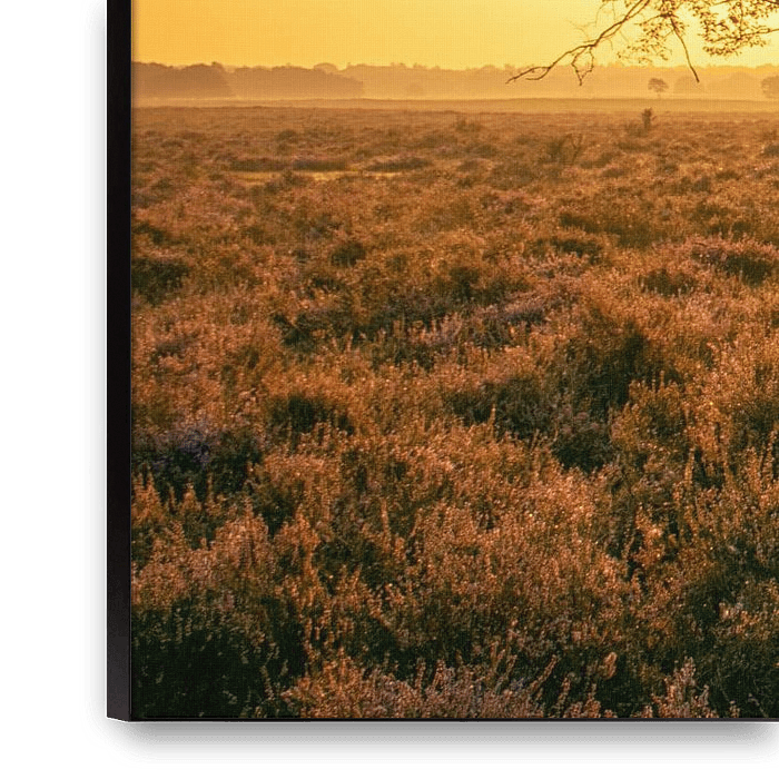 Heather fields during sunrise in Netherlands
