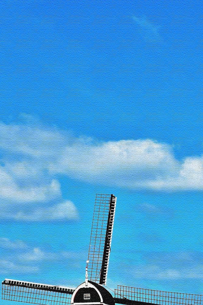 Wonderful typical Dutch image: a Dutch watermill towers above a field of yellow rapeseed with its sails. Above the mill, a blue sky with white and grey clouds. The mill is made of wood painted green and has a thatched underside. The vastness of this image is enhanced by the positioning of the mill and the horizon at the bottom of the image and the emptiness of the cloudy sky above. A fine, digitally textured layer has been applied over the image, giving the work the look of a painting painted on canvas.