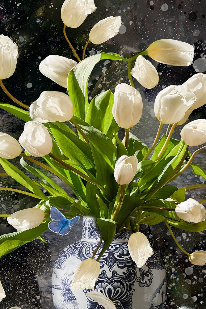 This work was made during the beginning of coron time and consists of a series of 5 works. Each work expresses a feeling during this time. There seemed to be a storm raging over the Netherlands. In all works world famous Dutch products were used. Like the tulips, Delft blue vases and the Kissing Couple.