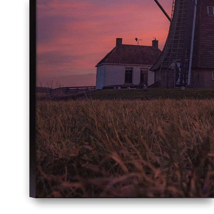 Buy this landscape artwork Dutch windmill at colourful sunset by Ewold Kooistra on canvas, ArtFrame, poster and wallpaper, printed on demand in high quality.