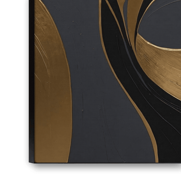 This beautiful abstract artwork exudes unparalleled elegance and sophistication. With its dynamic interplay of gold and black tones, it brings a modern feel to any room. The artist has created a unique piece that not only attracts attention but also stimulates the imagination. It is the perfect centrepiece for a contemporary living room or a stylish office. The golden elements reflect light at different times of the day, making the artwork change with the times. This painting is a must-have for lovers of minimalism with a touch of luxury.