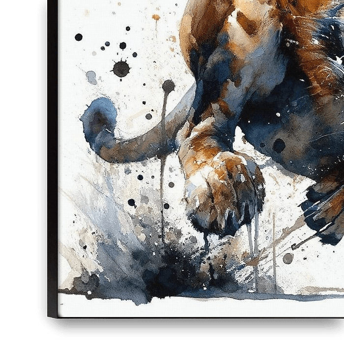 This artwork captures a lion mid stride, suspended in a split second of power and control. The body is angled forward, the paws lifted as if the ground is barely holding him, and the mane opens like a gust of wind. Warm ochre and sandy tones shape the muscles and fur, while deep shadows add depth and weight to the chest and…