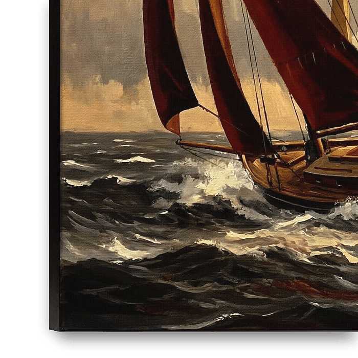 Immerse yourself in the dynamic energy of a sailboat race captured through the lens of impressionistic artistry. This vibrant oil painting portrays the thrill of competition on a choppy sea, where multiple sailboats with billowing sails—reddish-brown, yellow-tan, and dark blue—navigate the turbulent waters. The dramatic interplay of…