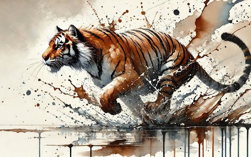 A full body tiger bursts across the scene in a powerful leap, captured mid motion with a focused gaze and a sweeping tail. Warm ochre and burnt orange shape the coat, while bold dark markings and crisp highlights define the muscles, shoulders, and paws. The background stays light and airy, letting energetic splashes and flowing paint…