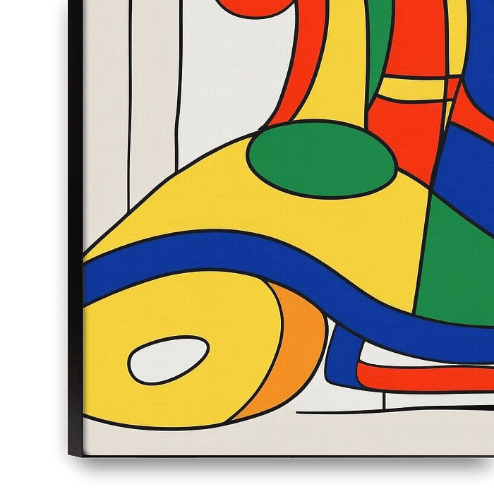 This colourful design full of dynamic shapes and bright hues is a real eye-catcher in any modern interior. The composition consists of flowing lines and contrasting colours such as red, blue, yellow and green, creating a lively play of shapes and movements. The abstract style makes it versatile in different rooms such as the living…