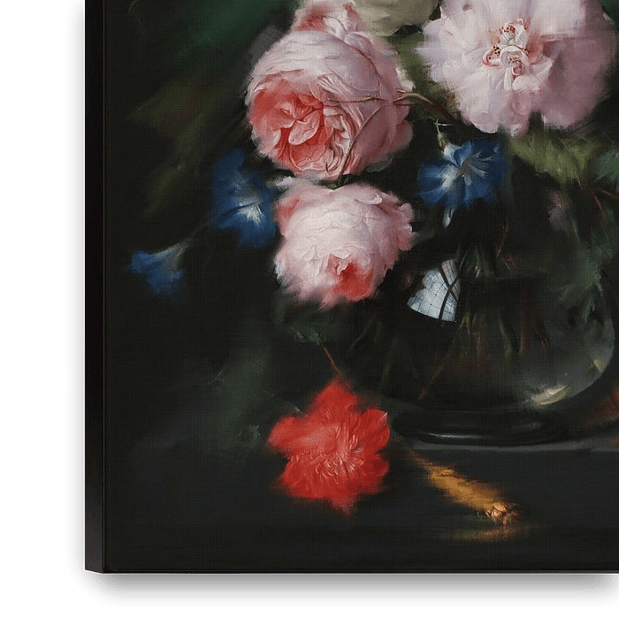 Dynamic still life with flowers in a glass vase, after the work of Jan Davidsz. de Heem, from 1650 - 1683, from the Rijksmuseum collection. But in a cleaned up, modern version. More colorful, contrasting and expressionistic.
