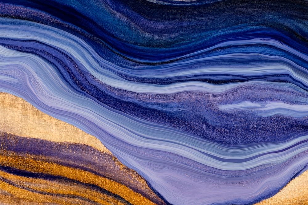 Gentle waves of deep blue and silky gold flow harmoniously into one another and create a calming, almost meditative atmosphere. The dynamic colour tones invite you to dream and add an elegant touch to any room. Perfect for a modern living room or a creative office, where inspiration and tranquillity merge.